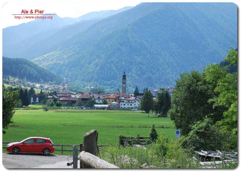 9 luglio 2011 - Raggiunta Marilleva con il treno ed incontrato Luigino, lungo il fiume Noce sulla pista ciclo-pedonale arriviamo nei pressi di Pellizzano ... boschi, cavalli e visione "lontana" dei piccoli borghi di: Roncio, Castello, Termenago e Menas