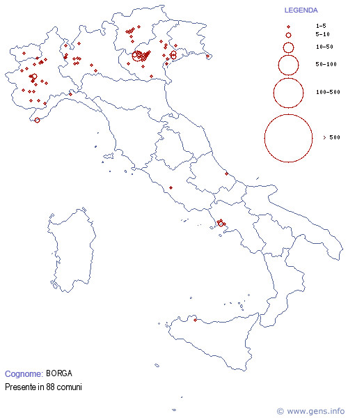 Diffusione in Italia dei cognomi Borga e Carta.